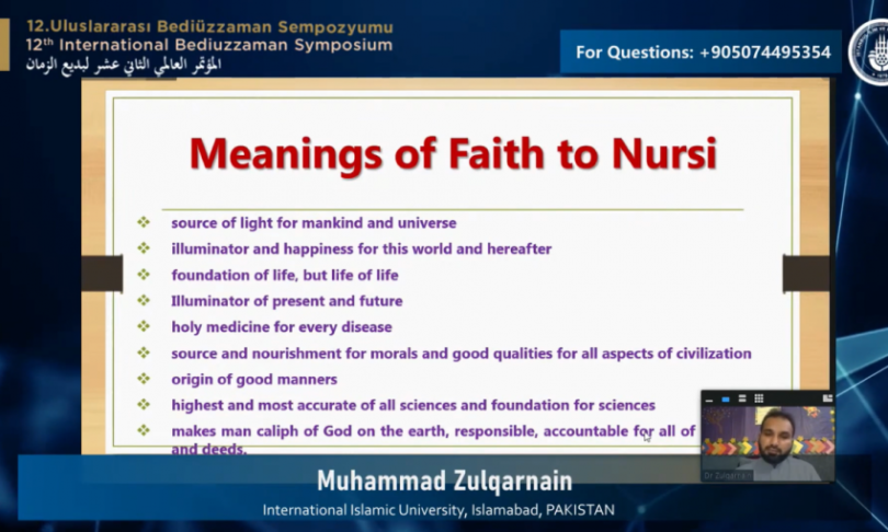PAKİSTAN İslamabad Uluslararası İslam Üniversitesi’nden Felsefe ve Akide üzerine çalışmalar yapmış olan Dr. Muhammad Zulqarnain 12. Uluslararası Bediüzzaman Sempozyumu’nda bir tebliğ sundu. Tebliğin konusu: “BEDİÜZZAMAN SAİD NURSİ’YE GÖRE İNANCIN ÇEŞİTLİ BOYUTLARININ YORUMU VE BUNUN MÜSLÜMAN TOPLUMLARIN YENİDEN UYANIŞI ÜZERİNE ETKİSİ”