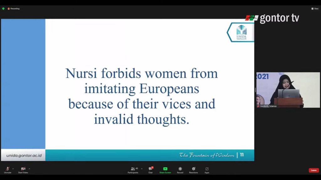 İİKV seminer salonu ve Gontor Üniversitesi’nden, internet üzerinden gerçekleşen seminerde Bediüzzaman Hazretleri’nin çevre ve cinsiyet üzerindeki fikirleri tartışıldı. Açılış konuşmalarını İİKV Mütevelli Heyet Başkanı Said Yüce ve Gontor Üniversitesi Rektörü Prof. Dr. K.H. Hamid Fahmy Zarkasyi yaptı. Seminerde Dr. Henri Shalahuddin, Netty Yuwanda, Said Nursi Köşesi Müdürü Moh. Isom Mudin ve İİKV’yi temsilen Dubai’den Dr. Ahmed Subaşı sunum yaptılar.
