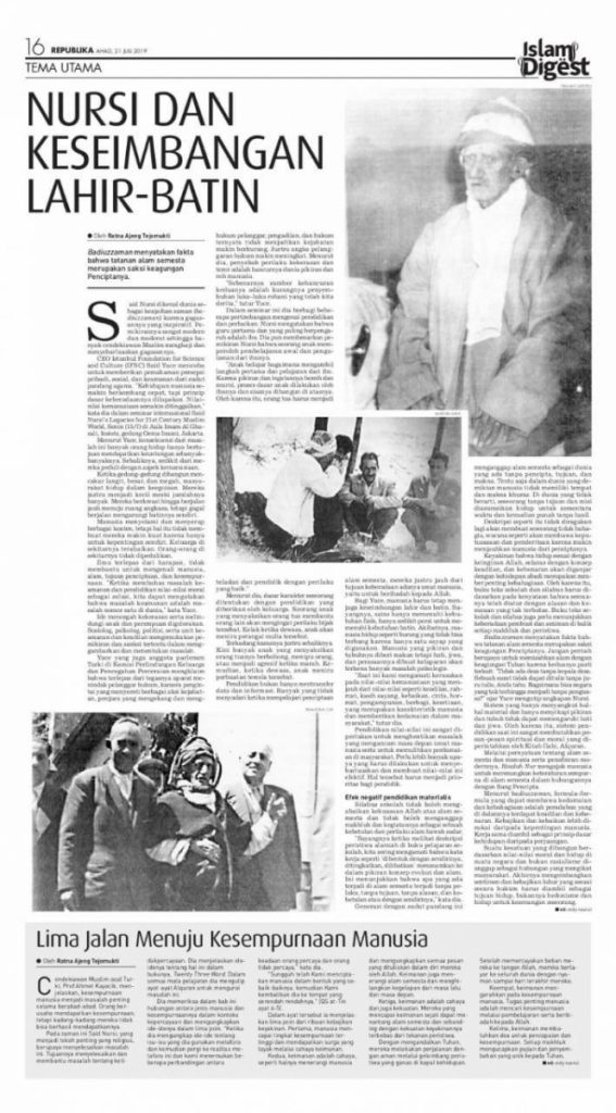 ENDONEZYA’nın milli gazetelerinden biri olan ve 1992’de kurulan “Republica” isimli gazetenin 21 Temmuz tarihli sayısında, üzerinden yıllar geçmiş olmasına rağmen, Bediüzzaman Said Nursi’nin fikirlerinin modern dünya için hala geçerli olduğundan bahsedildi. Bediüzzaman Said Nursi hakkında yazılan ilgili haberde “Onun dini politikleştirmekten uzak durduğu ve onun bu düsturunu çok takdir ettikleri” yazıyor. Ayrıca haberde “Said Nursi’nin eğitimde, materyalizme karşı yaptığı eleştiri”ye de yer veriliyor. Buna dayanarak İslami İlimlerin dünyada referans olabileceği de haberde belirtiliyor.